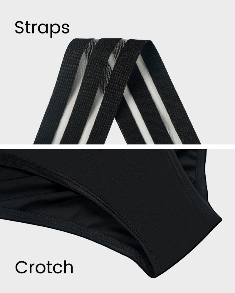 Striped Mesh Insert Cross-Over Halter Neck Swimsuit